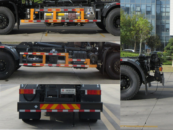 该车安装具有卫星定位功能的行驶记录仪,选装直接供电ETC车载装置,仅选装4500mm轴距;侧防护装置的材料材质:Q235B,后部防护装置的材料材质:Q345B,连接方式均为螺栓连接;后部防护装置的断面尺寸(宽赘?mm:60?40;后部防护装置离地高度440mm。可选装铝合金材质侧防护、其它款式吊臂、液压油箱、后挡板、后视影像,以上选装配置对尺寸及重量的影响可以忽略不计。随底盘选装侧窗、前雾灯、遮阳罩、前格栅造型及灯具。ABS型号/生产厂家:3631010-C2000/东科克诺尔商用车制动系统(十堰)有限公司,ABS-E 4S/4M/生产厂为威伯科汽车控制系统(中国)有限公司。该车主要由液压控制系统控制专用吊臂的起吊、拉装工作,从而实现放置在地面的装载有生活垃圾的垃圾箱体的转运功能。 |