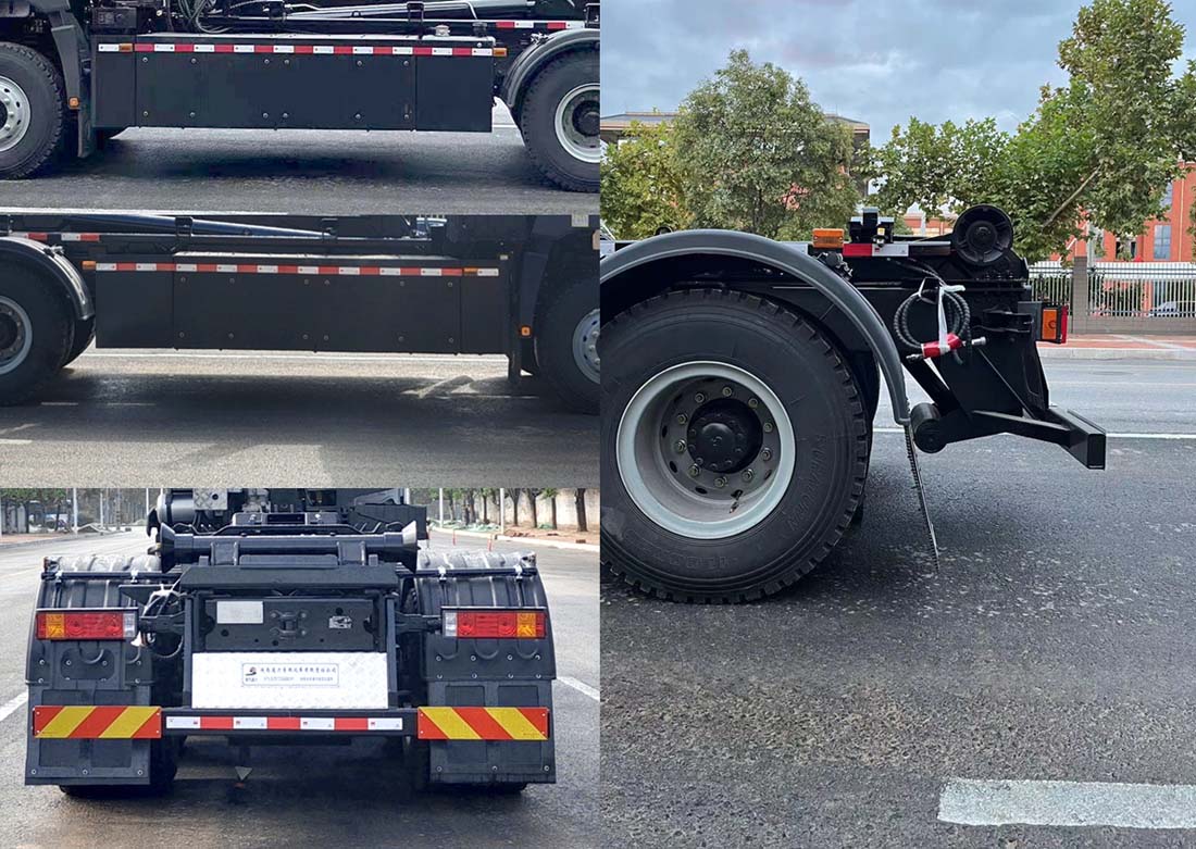 1、该车仅选用4575+1400mm底盘轴距改装;2、该车专用装置由拉臂钩系统、液压系统等组成,通过拉臂系统实现垃圾箱的装卸及垃圾卸料作业功能,并能对垃圾箱进行转运及运输的功能;3、侧防护装置材料为Q355,连接方式为螺栓连接;后防护装置材料为Q355,连接方式为螺栓连接,截面尺寸为120?0mm,离地高为490mm;4、储能装置种类/型号/生产企业:磷酸铁锂蓄电池/CB240/宁德时代新能源科技股份有限公司;5、TZ420XS360K01型驱动电机峰值功率360kW、额定功率250kW;TZ380XS002型驱动电机峰值功率360kW、额定功率250kW;TZ400XS023型驱动电机峰值功率360kW、额定功率240kW;TZ380XS010型驱动电机峰值功率410kW、额定功率250kW;6、ABS系统生产厂家及型号分别为:西安正昌电子股份有限公司(型号:ZQFB-V),广州瑞立科密汽车电子股份有限公司(型号:CM4XL-4S/4M);7、该车型可选装直接供电式ETC车载装置;8、随底盘选装同系列驾驶室前面罩外观、前保险杠及前组合灯具、选装驾驶室无后窗外观、顶置喇叭外观、翼子板、上车踏梯样式;9、驱动电机/驱动电机控制器配置关系为:TZ420XS360K01/KTZ60X69S01、TZ380XS002/KTZ60X70S002、TZ400XS023/KTZ65X69S027、TZ380XS010/KTZ60X70S008;10、该车装备具有卫星定位功能的行驶记录仪。 |
