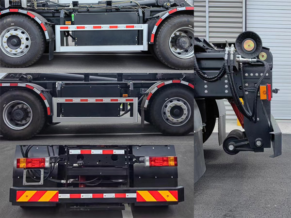 | 1.该车选用底盘1850+3200+1350mm轴距,该车由拉臂钩、液压(气动)电气控制等系统组成,实现勾箱卸箱和卸料作业;该车选装A型拉臂钩时,外形尺寸为9290?550?125,3225mm,整备质量为13900kg,载质量为17970kg;该车型选装B型拉臂钩时,外形尺寸为9290?550?900,3000mm,整备质量为13450kg,载质量为18420kg;该车型选装C型拉臂钩时,外形尺寸为9440?550?125,3225mm,整备质量为14200kg,载质量为17670kg;2.侧面防护装置材质为铝合金6061,连接方式为焊接连接,后防护装置材质为Q355B,连接方式为焊接连接;后部防护装置断面尺寸为180?6?mm,离地高度为460mm;3.ABS型号/生产企业:CM6XL-6S/6M/广州瑞立科密汽车电子股份有限公司;4.储能装置单体种类/单体生产企业/总成生产企业:磷酸铁锂蓄电池/宁德时代新能源科技股份有限公司/宁德时代新能源科技股份有限公司;5.驱动电机类型:永磁同步电动机,驱动电机型号/生产企业/额定功率/峰值功率分别为TZ315XS230/浙江盘毂动力科技有限公司/125kW/230kW;6.安装具有卫星定位功能的行驶记录仪;7.可选装ETC车载装置;8.选装B,C款结构外观; |