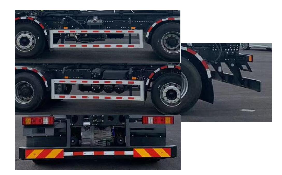 | 1.该车选用底盘1950+3900+1350mm轴距,由拉臂钩、液压(气动)电气控制等系统组成,实现勾箱卸箱和卸料作业;2.储能装置种类/生产企业:磷酸铁锂蓄电池/宁德时代新能源科技股份有限公司;3.驱动电机型号/类型/额定功率/峰值功率:TZ360XS230/115/230,驱动电机数量为2,安装位置为第3轴和第4轴;4.侧防护装置材料为铝合金,与车辆连接方式为螺栓连接;后防护装置材料为Q235,与车辆连接方式为螺栓连接;后部防护装置的断面尺寸为180?0?mm,离地高度为440mm;5.ABS型号/生产企业:ABS-E/采埃孚商用车控制系统(青岛)有限公司;6.安装具有卫星定位功能的行驶记录仪;7.选装车载ETC装置;8.随底盘选装不同造型前保险杠;9.该产品销售时,可按国家有关规定采用车电分离方式销售;选装后部标识外观 |