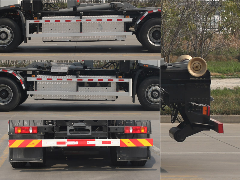 该车用于垃圾的收集清运,主要专用装置为勾臂.侧防护材料为铝合金,螺栓连接;后防护材料为Q235,焊接,截面尺寸:120?0mm,下边缘离地高485mm.仅采用轴距4500mm.储能装置种类为:磷酸铁锂电池,储能装置单体/总成生产企业均为:宁德时代新能源科技股份有限公司.选装限速装置,限速:89km/h.ABS型号/生产企业:J ABS/焦作博瑞克控制技术有限公司.该车安装具有卫星定位功能的行驶记录仪.选装驾驶室前角扰流板、前雾灯,选装卧铺侧窗装饰板,选装驾驶室顶部中间三个装饰灯,驾驶室选装不同前面罩、灯具和后视镜.该车可选装直接供电式ETC车载装置.选装多路阀位置及液压油管布局. |