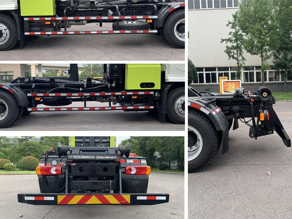 ABS系统型号:VIE ABS-II,生产企业:浙江万安科技股份有限公司.该车仅选用5000mm轴距,随底盘配装限速装置,最高车速为:89km/h;选装描述:随底盘选装导流罩,选装不带前置摄像头.选装导流罩、遮阳罩喷涂“吉利商用车”字样,该车型可选装ETC车载装置.储能装置种类/生产企业:磷酸铁锂蓄电池/宁德时代新能源科技股份有限公司;驱动电机额定功率/峰值功率:120kW/180kW;该车安装具有卫星定位功能的行驶记录仪;侧后防护情况:侧防护材质为Q235B,选装铝合金,选装Q235B时侧护栏压型外观,连接方式为螺栓连接;后防护材质为Q345B,连接方式为螺栓连接,截面尺寸为180mm?0mm,离地高度为410mm;专用功能及装置:该车专用装置为拉臂式自装卸装置,通过液压系统,实现对垃圾的装载及卸料的作业功能. |