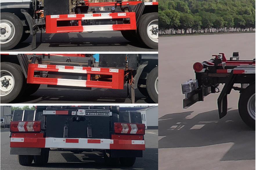 1、储能装置种类/生产企业/型号:磷酸铁锂蓄电池/宁德时代新能源科技股份有限公司/L173TB1。2、ABS型号/生产企业:RL-3550/瑞立集团瑞安汽车零部件有限公司。3、驱动电机类型/生产企业/型号:永磁同步电机/广西玉柴机器股份有限公司/TZ220XSK07,额定功率为45kW,峰值功率为100kW,电机控制器生产企业/型号:广西玉柴机器股份有限公司/KTZ39X35S01,整车控制器生产企业/型号:广西玉柴新能源汽车有限公司/YCNEV-VCU003。4、随底盘选装不带补盲镜、门把手样式,选装储能装置外罩样式;标配无备胎,可选装备胎及备胎安装位置,选装拉臂上装样式,选装不同规格轮胎。5、可选装直接供电的ETC车载装置。6、侧防护装置的材料材质:Q235,连接方式为螺栓连接;后防护装置的材料材质:Q235,连接方式为螺栓连接;后部防护装置的断面尺寸(宽赘?mm:125?5,后部防护装置的离地高度350mm。7、该车通过勾臂装置及液压系统,实现对垃圾的装载及卸料的作业功能。8、该车型整备质量不包括备胎、灭火器、随车工具等。