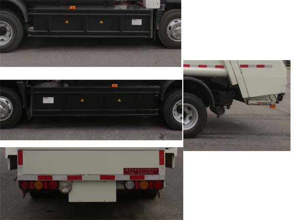 1、动力蓄电池种类:磷酸铁锂电池,生产企业:惠州比亚迪电池有限公司,型号:FADM07315B,电池布置位置:车辆底部;2、ABS系统生产企业:威伯科汽车控制系统(中国)有限公司司,ABS系统型号:446 004 630 0;3、侧防护装置所用材料为Q235钢板,用螺栓与底盘电池箱支架连接,车身结构满足后防护的安装要求,后防护离地高度为485mm;4、标准车总长为6370,额定载质量为1510,整备质量为5680;5、选装翻转架式提升机构后伸量为400,车总长为6770,额定载质量为1350,整备质量为5840;6、选装料斗式提升机构后伸量为300,车总长为6670,额定载质量为1310,整备质量为5880;7、可在全国销售;8、产品的技术阶段:发展期;9、本车安装推板、厢体及后门,主要用于储存、装卸及运输垃圾。 |