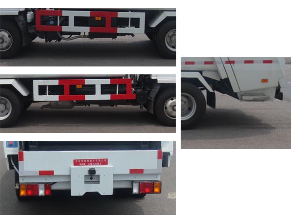 | 1、标准车总长为6200,额定载质量为2780,整备质量为4390。2、选装翻转架式提升机构后伸量为400,车总长为6600, 额定载质量为2620,整备质量为4550。3、选装料斗式提升机构后伸量为300,车总长为6500,额定载质量为2580,整备质量为4590。4、侧防护装置所用材料为Q235钢板,与底盘纵梁螺栓连接。车身结构满足后防护的安装要求,离地高度为430mm。ABS及其控制器型号为:APG3550500A4,生产厂家为:浙江亚太机电股份有限公司。5、本车仅选用4KH1CN5HS发动机,最大净功率94,油耗15.6。6、本车安装推板、厢体及后门,主要用于储存、装卸及运输垃圾。 |