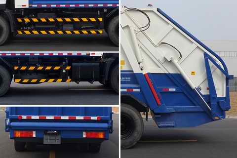 采用底盘4350+1350mm轴距.该车选用11.00-20 18PR,11.00R20 18PR轮胎.当准乘人数为2人时,额定载质量9490kg,9090kg、为3人时额定载质量9425kg,9025kg.该车工作装置有5种配置,可选装:提斗装置(A)、无上料装置(B)、翻(铁)桶装置(C)、翻斗装置(D)、翻铁桶提斗装置(E).配置A、D、E时,整备质量15780kg;配置B、C时,整备质量15380kg,.配置A时,长10015mm,后悬2835mm;配置B时,长9845mm,后悬2665mm;配置C时,长10225mm,后悬3045mm;配置D时,长9885mm,后悬2705mm;配置E时,长10245mm,后悬3065mm;该车装有垃圾箱体、填装器、后上料装置,用以收集、处理、转运垃圾作业.还可根据装载垃圾桶类型选装翻桶装置的局部外观.侧面防护装置的材料材质为Q235A,连接方式为螺栓连接;后部防护装置与工作装置干涉,故豁免.后下部工作装置最大离地高度为490毫米.随底盘装ABS,ABS生产厂家:东科克诺尔商用车制动系统(十堰)有限公司;型号:3631010-C2000.安装具有卫星定位功能的行驶记录仪.随底盘选装ISD245 50发动机,油耗值为35.4;选装ISD270 50发动机,油耗值为35.9.该车整车涂装可变. |