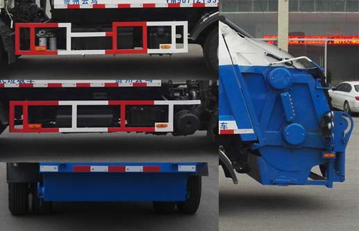 | 平头、4?后桥驱动,弧型骨架式结构,举升板式填装机构,推出式后卸料的压缩式垃圾车.该车有3种配置:A(标准型)、B(选翻桶机构)、C(选装带门、带翻桶机构).配置A时,整备质量4380kg,额定载质量2785kg,总长6250mm,后悬1857mm,接近角/离去角(?:27/14;配置B时,整备质量4520kg,额定载质量2645kg,总长6420mm,后悬2027mm,接近角/离去角(?:27/11;配置C时,整备质量4550kg,额定载质量2615kg, 总长6420mm,后悬2027mm,接近角/离去角(?:27/11.侧面防护装置材料为Q235,与车辆的连接方式为螺栓连接.工作装置代替后下部防护,最大离地高度320mm.仅选用发动机YC4FA115-50、CY4BK451发动机. YC4FA115-50最大净功率为80kW,油耗值为17.1L/100km; CY4BK451最大净功率为83kW,油耗值为17.2L/100km. 选装新造型的前面罩.选装前雾灯.ABS型号及厂家:ABS/ASR-24V-4S/4M,襄阳东风隆诚机械有限责任公司. |