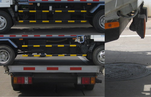 | 后部为垃圾桶翻转机构时车辆长度为:6855mm,整备质量为4680kg;车辆后部选装簸箕型机构时,车辆长度为6425mm,高度为2600mm,整备质量为4680kg;车辆侧边选装裙边结构时整备质量为4850kg.后伸:265(簸箕型机构),695(垃圾桶翻桶机构).侧防护材料材质为Q235,侧防护总成与车架连接方式为螺栓连接,由于车辆后部有专用装置无法安装后部防护,后部离地高度为380mm,借用底盘自带灯具;装ABS,ABS及其控制器型号为:APG3550500A4,生产厂家为:浙江亚太机电股份有限公司. |