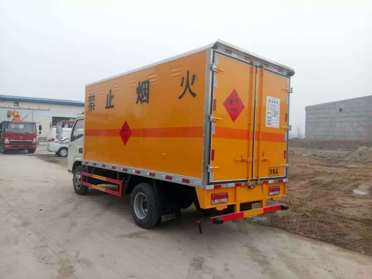 运输品名:炸药,雷管,类项号: 1.1D,1.1B。车厢顶部封闭,不可开启,侧防护为螺栓连接,后防护为焊接连接,后部防护装置断面尺寸(宽×高):50mm×100mm,离地高度为410mm.该车装配具有卫星定位功能的汽车行驶记录仪,该车装配有限速装置,ABS控制器型号及生产企业:CM4XL-4S/4M,广州科密汽车电子控制技术股份有限公司,安装前盘式制动器. |