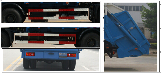 1.东风天锦压缩垃圾车应在后部安装车身反光标识和后尾标志;2.仅选配轴距3800mm底盘.3.该车有4种配置:A(基本型),B(选装摆臂装置),C(选装提斗装置),D(选装提桶装置),配置A时参数对应关系(总长/前悬/后悬/整备质量/额定载质量):7690/1440/2450/10560/1740,配置B时(总长/整备质量/额定载质量/后伸):8055/11060/1240/190,配置C时(总长/整备质量/额定载质量/后伸):7930/11285/1015/240,配置D时(总长/整备质量/额定载质量/后伸):7880/10960/1340/365;4.侧面防护装置材质:Q235-A,与底盘大梁连接方式:螺栓连接;5.后下部防护装置离地高度540mm,豁免;6.安装具有卫星定位功能行驶记录仪;7.装有ABS,ABS型号:3631010-C2000,生产厂家:东风电子科技股份有限公司制动系统公司. |