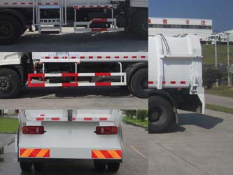仅选用底盘轴距4500mm;该车4组配置:A(无选装装置)、B(选装安全撑杆)、C(选装手动阀)、D(选装清洗装置);配置A、B和C,整备质量8280kg,额定载质量9525kg;配置D,整备质量8420kg,额定载质量9385kg。侧防护及后防护装置的材料材质为:Q235A,联接方式为:螺栓联接;车厢后裙部替代后防护,离地高490mm。随底盘选装前围扰流罩,选装前雾灯,选装卧铺侧窗装饰板。ABS型号:3631010-C2000,4460046440;生产厂家:东科克诺尔商用车制动系统(十堰)有限公司,威伯科汽车控制系统(中国)有限公司。 |