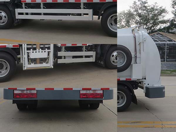 仅选用3360mm轴距.安装两种ABS,ABS型号/生产厂家分别是ABS 8.1 EA106/博世汽车部件(苏州)有限公司,ABS 8/克诺尔制动设备(上海)有限公司.选装垃圾输送装置,选装时整备质量为4780kg,额定载质量为2450kg;选装称重系统.车辆侧面防护装置的材质为铝合金,连接方式为螺栓连接;后下部防护装置采用后门专用装置代替,其最大离地高度为395mm. |