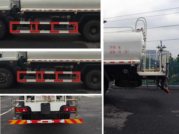 1.随底盘选装灯具保险杠等驾驶室新风格。2.罐体有效容积:11立方米。介质:水,密度1000千克/立方米。罐体外形尺寸(长壮ぶ嶙短轴)(mm): 5050?240?350。3,侧,后防护装置材料材质:Q235,侧、后防护连接方式均为焊接加螺栓连接,后部防护断面高度:100mm,断面宽:50mm,离地高度:500mm。选装限速装置,限速80km/h;ABS型号为3631010-C2000,生产厂家为东科克诺尔商用车制动系统(十堰)有限公司. |