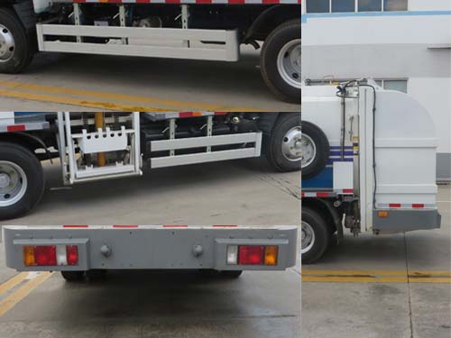 随底盘选装加宽外后视镜.选装称重系统.选装塑料材质护轮板.ABS及其控制器型号为:APG3550500A4,生产厂家为:浙江亚太机电股份有限公司.车辆侧面防护装置材质为铝合金,连接方式为螺栓连接.后下部防护装置采用后门专用装置代替,最大离地高度为450mm. |