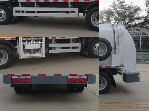 仅选用3360mm轴距.随底盘安装ABS,ABS型号,生产厂家分别是:ABS 8.1 EA106,博世汽车部件(苏州)有限公司,ABS 8,克诺尔制动设备(上海)有限公司,CM4XL-4S/4M,广州科密汽车电子控制技术股份有限公司.随底盘选装带有昼间行车灯的前组合大灯.选装垃圾输送装置,选装时整备质量为4780kg,额定载质量为2450kg;选装称重系统.车辆侧面防护装置的材料材质为铝合金,连接方式为螺栓连接.后下部防护装置采用后门专用装置代替,最大离地高度为395mm. |
