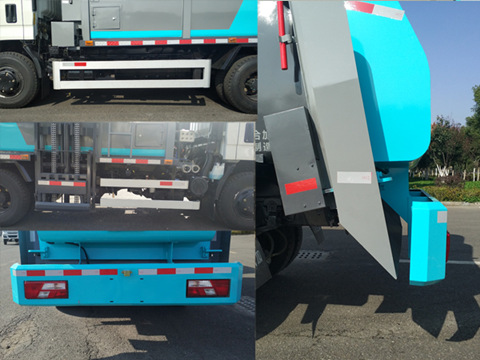 随底盘选装前雾灯;装有ABS,ABS系统型号:VIE ABS-II,生产厂家:上海万捷汽车控制系统有限公司;侧面防护装置材质为铝合金,连接方式为螺栓连接,后部防护装置材质为Q235A,焊接连接,断面尺寸为360?0mm,离地高度为490mm;该车厢体有2种外观(A型和B型),专用装置由垃圾箱、垃圾桶提升机构等组成,用于餐厨垃圾收集,转运及卸料作业. |