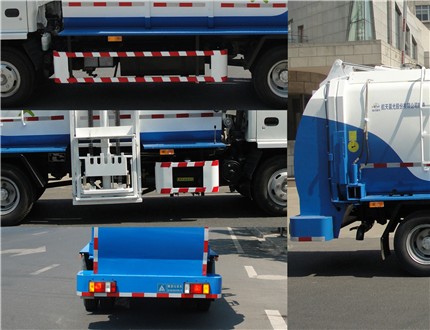 该车可配置有无尾部导流罩箱体1和有尾部导流罩箱体2两种箱体状态,其中配置箱体1时车辆长度为6020mm,后悬1645mm,离去角14?配置箱体2时车辆长度为5955mm,后悬1580mm,离去角13?该车每种箱体状态可具有配置A型链条式,B型拉杆式两种侧提桶机构,配置A型侧提桶机构时整车高度为2560mm,整备质量为4550kg,配置B型侧提桶机构时整车高度为2650mm,整备质量为4400kg;该车随底盘装ABS,ABS及其控制器型号为:APG3550500A4,生产厂家为:浙江亚太机电股份有限公司.侧防材料Q235,连接方式:螺栓连接.后防护由车辆尾部专用作业装置代替,离地高445mm. |