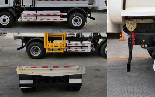 1.蓄电池类型/生产企业:三元锂离子电池/宁德时代新能源科技股份有限公司;2.驱动电机额定功率为60kW,峰值功率为120kW;3.ABS型号:CM4XL-4S/4M,VIE ABS-II(12V),ABS生产企业:广州瑞立科密汽车电子股份有限公司,浙江万安科技股份有限公司;4.主要专用装置有餐厨垃圾车举升机及卸料装置,由垃圾箱、垃圾桶提升机构等组成,用于餐厨垃圾收集、转运及卸料作业;5.侧防护栏材质为铝合金,连接方式为螺栓连接;6.后防护装置的材料材质为Q235,连接方式为螺栓连接,后防护尺寸(长卓碜高)(mm):1885?0?00,离地高度为390mm;7.选装带刀阀、清洗装置。