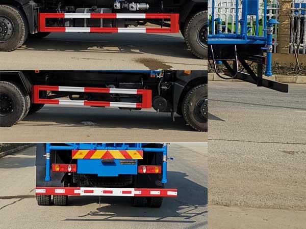 选装驾驶室。选装后高位花洒,选装方圆管道箱,选装后雾炮装置,选装后弧形喷雾.选装LED箭头指示灯,选装后平台式样,选装喷枪安装位置。罐体有效容积11.55立方米;运输介质:水,密度:1000千克/立方米;罐体外形尺寸(长度壮ぶ嶙短轴)(mm):5000?320?450。ABS型号及生产厂家为:3631010-C2000/东科克诺尔商用车制动系统(十堰)有限公司,J ABS/焦作博瑞克控制技术有限公司.侧防护采用Q235,螺栓连接。后防护采用Q235,焊接连接。后防护截面高度尺寸120mm,截面宽度尺寸50mm,下边缘离地高度500mm。车辆长/轴距/前悬/后悬对应关系为:8550/4500/1450/2600,8860/4500/1450/2910,8350/4500/1250/2600,8660/4500/1250/2910。专用装置主要是罐体和喷洒系统,用于园林绿化,洒水作业