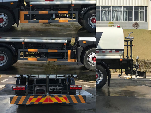仅选用3950mm轴距;罐体外形长轴锥讨嶙长度(mm):2400?450?200,罐体有效容积:10.09立方米;介质名称为:水;介质密度:1000 千克/ 立方米.该车有两种配置:A(标配);B(选装自动水炮)。 各配置整车长度(mm)/前悬(mm)/对应关系如下:配置A:7390/1260;配置B:7840/1710;侧防护及后部防护装置的材料材:Q235A;连接方式为螺栓连接;后部防护装置的断面尺寸(宽赘?mm:60?30;后部防护装置的离地高度480mm;可选装:1、后上喷雾装置;2、后下喷雾装置;3、左右侧浇花管;4、左右无自吸套管;5、后部无左右花洒;6、下水道疏通装置;7、选装作业指示灯;以上7种选装配置引起的重量及整车尺寸变化可以忽略不计。随底盘选装驾驶室外观、踏板反射器,铝合金油箱。该车装备有罐体,水泵,管道系统等,用于清洗路面,对路面喷洒水降尘等作用。ABS型号/生产厂家:J ABS/焦作博瑞克控制技术有限公司。