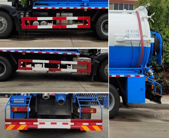 1.该车用于下水道清洗或吸污,主要专用装置为真空泵和罐体;罐体尺寸为(直段长字本?(mm):5000?850,其中罐体前段为清水罐(直段长2000mm),有效容积:5.5立方米,后段为污水罐(直段长3000mm),有效容积:8.5立方米;两罐独立,且不能同时满载,清洗功能时用清水罐,吸污功能时用污水罐,清洗吸污功能不同时使用;2.侧后防护装置材料均为Q235,连接方式均为焊接,后部防护断面尺寸(mm):240?0,离地高度(mm):480;3.随底盘选装驾驶室,仅选用4500mm,4700mm轴距改装;选装后部不安装卷盘时整车长8300mm;外廓尺寸长度/轴距/后悬(mm)对应关系8600/4700(4500)/2470(2670),8300/4700(4500)/2170(2370);4.ABS系统控制器生产企业/型号为威伯科(上海)管理有限公司/4460046300;选装EBS,EBS系统控制器生产企业/型号为威伯科(上海)管理有限公司/EBS3.